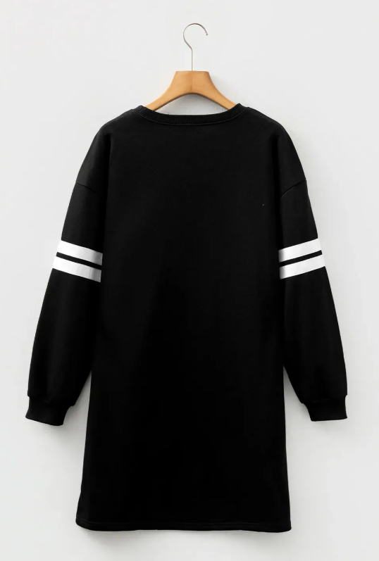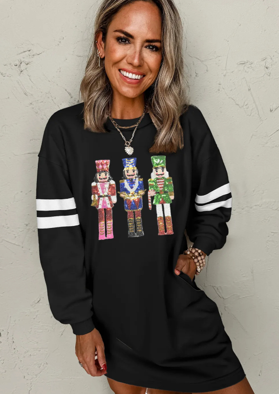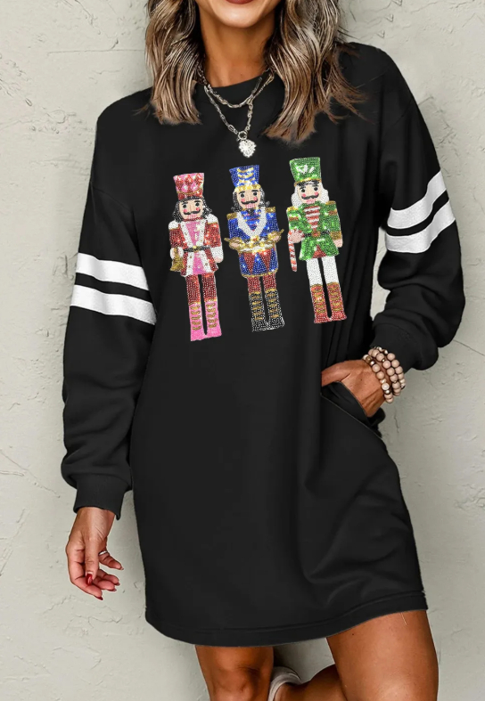 Black Christmas Sequin Nutcracker-man Graphic Varsity Striped Sleeve Sweatshirt Dress